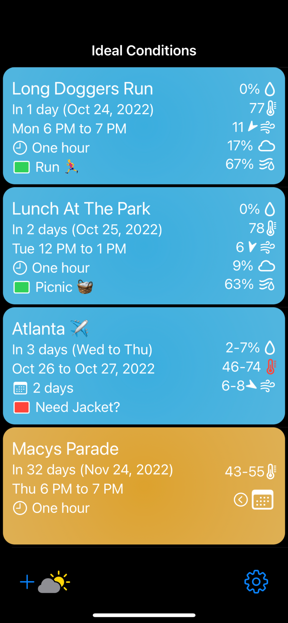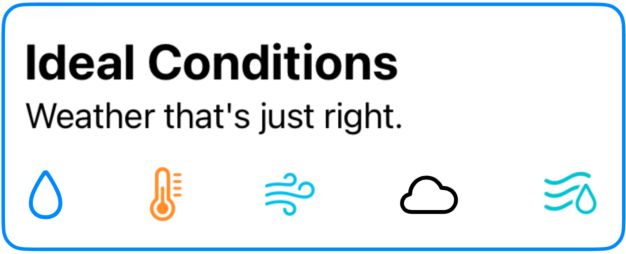 For events you must attend, you'll know the weather conditions in the weeks and days before. For events that depend on the weather, Ideal Conditions indicates if conditions are "just right" or may be questionable. Bicycle without rain and without strong winds. Go to the beach on a sunny day. Fly a kite when it's breezy. Land in another city with a jacket for cool weather. Picnic in mild temps. Do what you like to do.